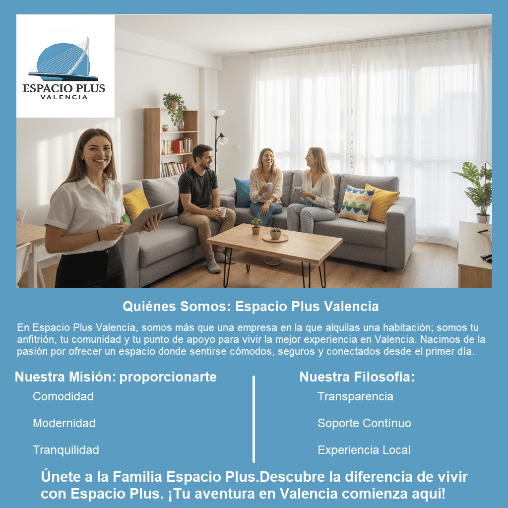 En Espacio Plus Valencia, somos más que una empresa en la que alquilas una habitación; somos tu anfitrión en esta vibrante ciudad, tu comunidad y tu punto de apoyo para vivir la mejor experiencia en Valencia. Nacimos de la pasión por ofrecer a estudiantes y jóvenes profesionales un espacio donde sentirse cómodos, seguros y conectados desde el primer día.